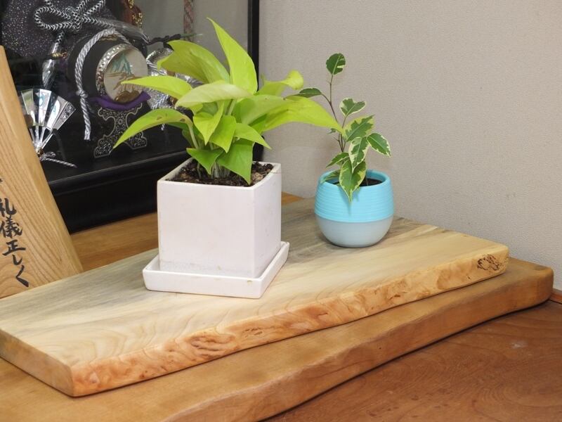 年輪が綺麗に見えるように天然木独特のモダンな形や、個性や表情の違うものを集め花台や飾り台としてあります。