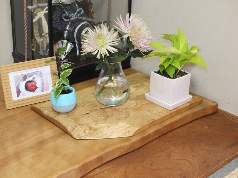 年輪が綺麗に見えるように天然木独特のモダンな形や、個性や表情の違うものを集め花台や飾り台としてあります。